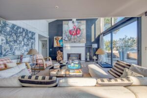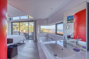 Le séjour avec cheminée s’ouvre sur une terrasse panoramique, tandis que la salle à manger et la cuisine équipée offrent un espace convivial avec vue sur le bassin. La suite parentale avec lit king size, climatisation, propose un dressing et une salle de bains complète. Les trois autres chambres, toutes équipées de lits en 160cm, dressings et salles d’eau privatives, offrent un confort optimal avec une vue exceptionnelle. La buanderie, les toilettes séparés et une décoration minimaliste complètent le tableau.