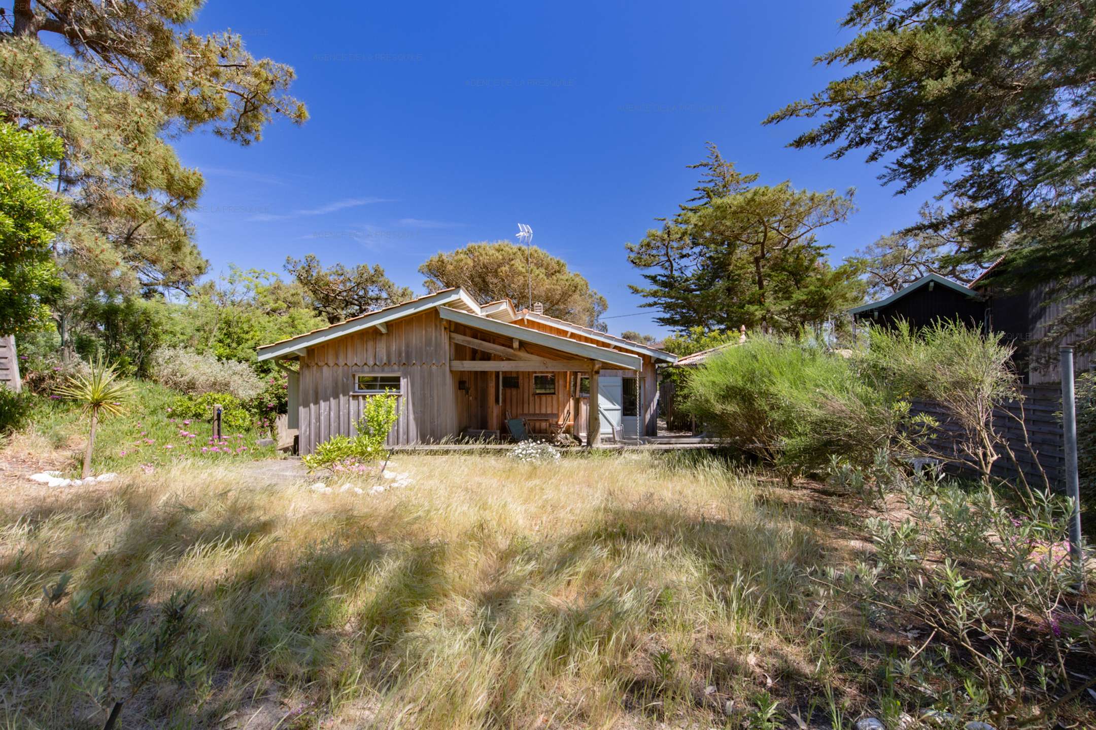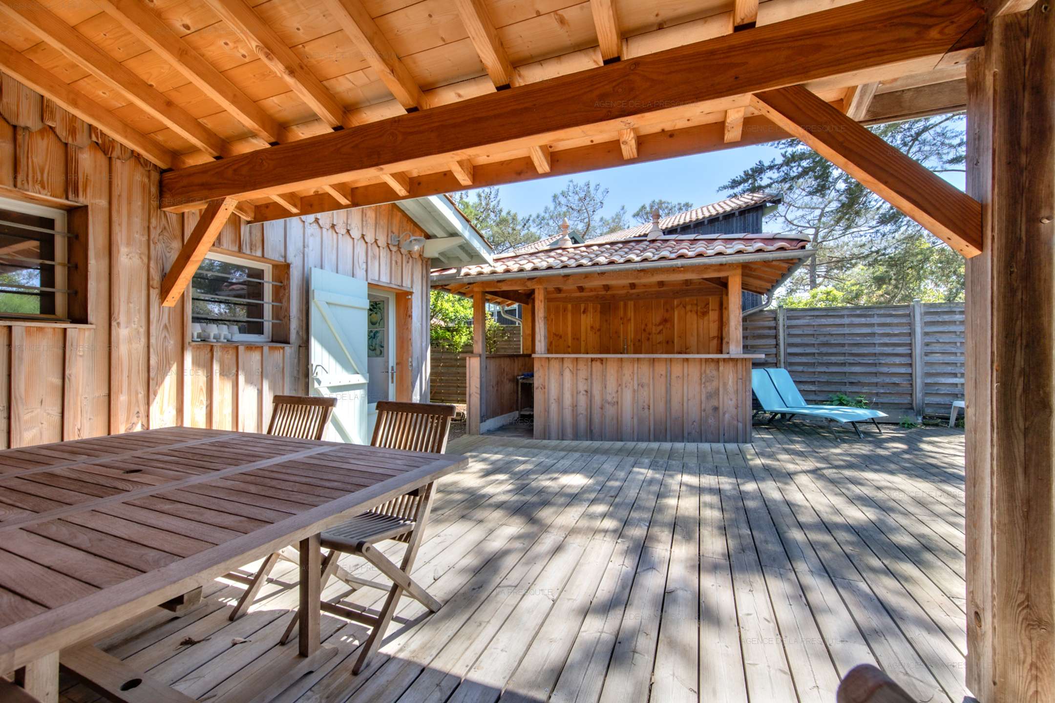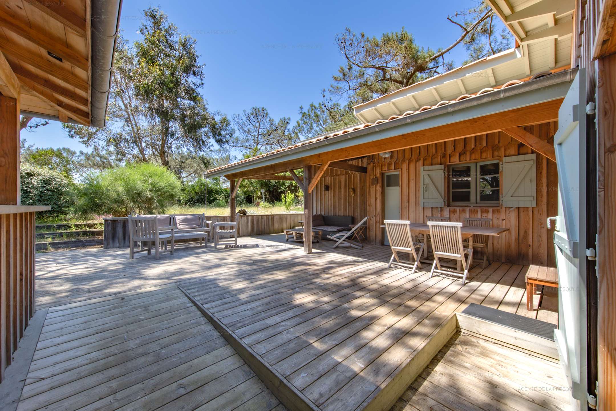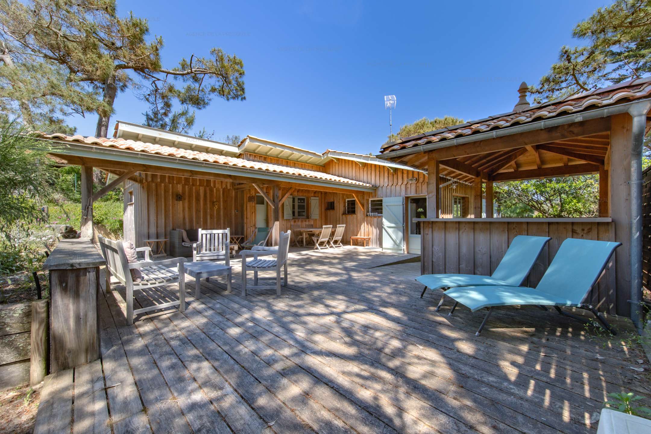Discover this pleasant villa at the entrance to Cap-Ferret at the foot of the ocean dunes. The main villa consists of an open kitchen, a living/dining room, two bedrooms, a shower room and a separate toilet. You can enjoy its independent studio composed of two bedrooms, one with a kitchenette, a shower room and a toilet. Its exterior will allow you to benefit from a summer kitchen with its bar, a dining area and an outdoor shower, all on a beautiful enclosed and wooded garden.