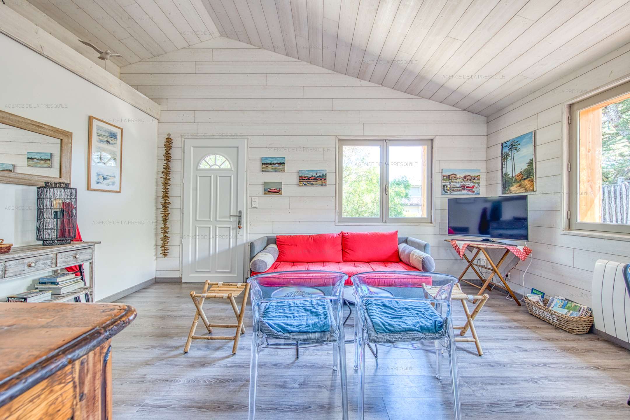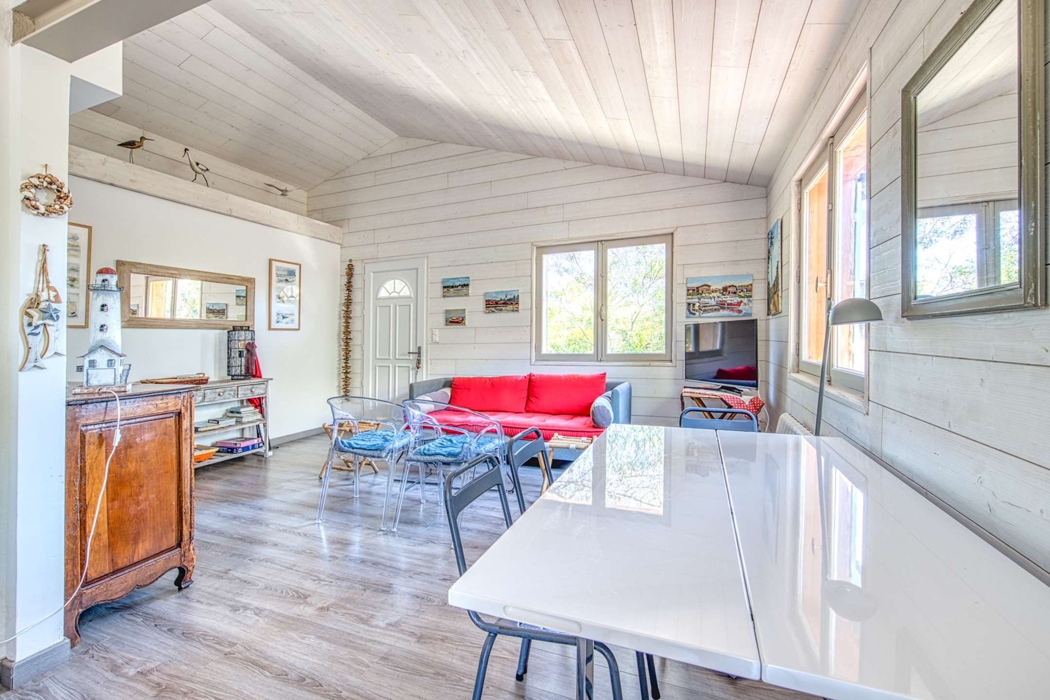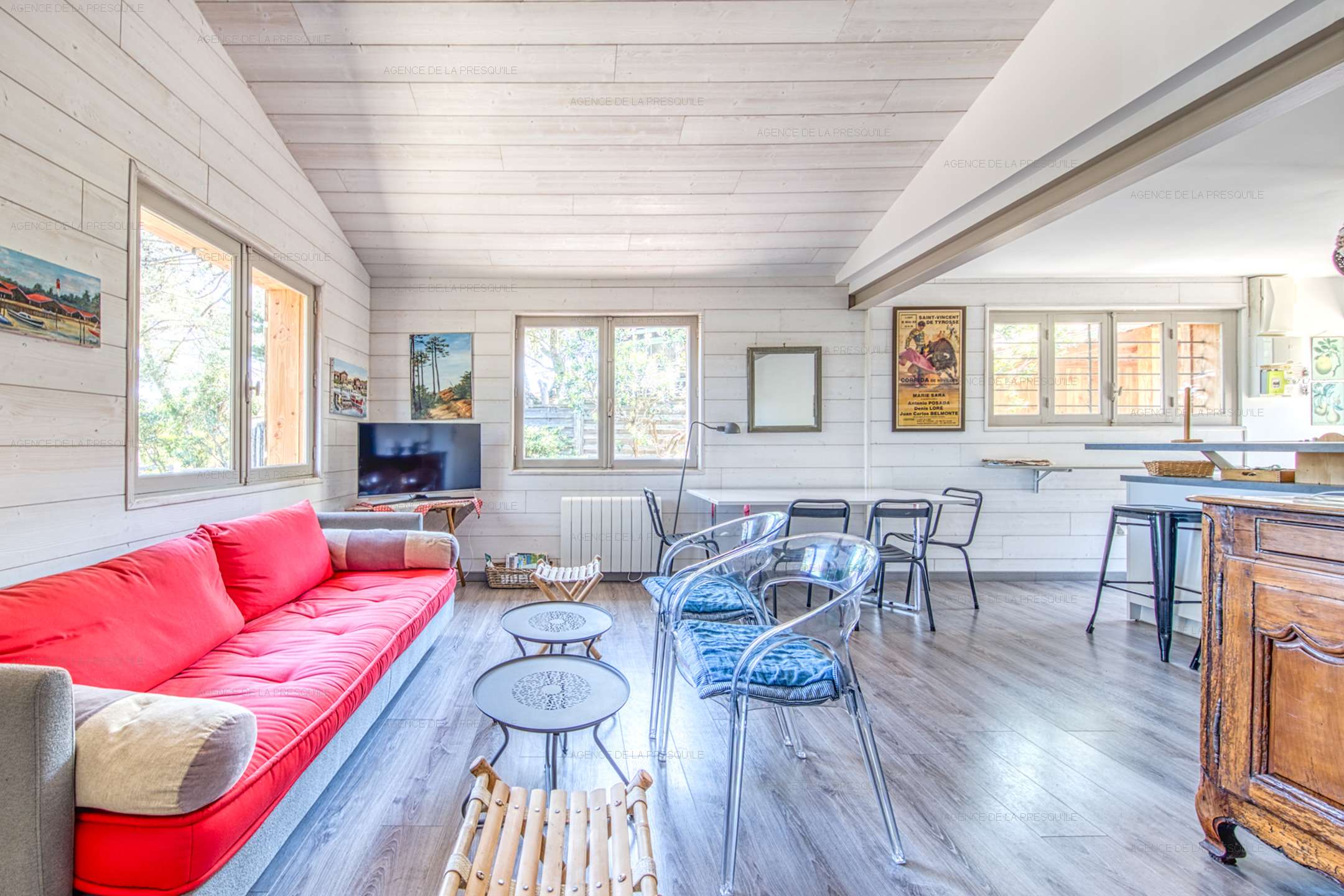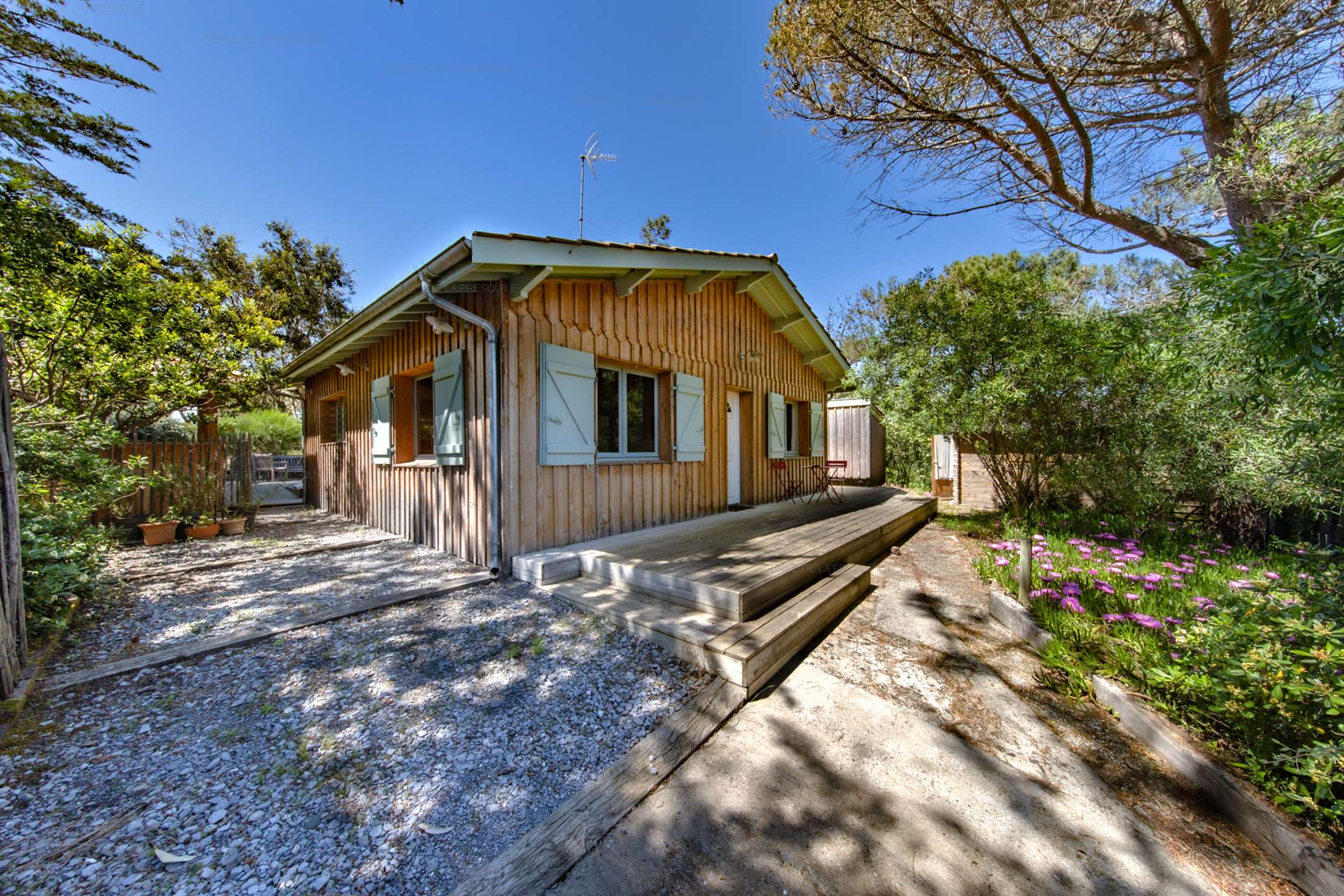 Discover this pleasant villa at the entrance to Cap-Ferret at the foot of the ocean dunes. The main villa consists of an open kitchen, a living/dining room, two bedrooms, a shower room and a separate toilet. You can enjoy its independent studio composed of two bedrooms, one with a kitchenette, a shower room and a toilet. Its exterior will allow you to benefit from a summer kitchen with its bar, a dining area and an outdoor shower, all on a beautiful enclosed and wooded garden.