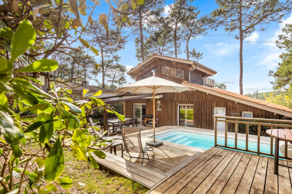 Located in the Pointe auc Chevaux district, this charming elevated wooden villa will win you over with its open view over the pine trees. The house featured beatiful furnished terrace with a heated swimming pool, ideal for family meals or gatherings with friends. The house offers a pleasant, bright living room with a dining area and a fully equiped kitchen. Th sleeping area includes two bedrooms, one of which has a private bathroom, a shower room and a separate toilet. Upstairs, there is a third bedroom with a shower and wahbasin. The house is equipped with reversible air conditioning. Thanks to its prime location, the villa provides easy access to the beaches on both the Bassin side and the ocean side, as well as to nearby shop.