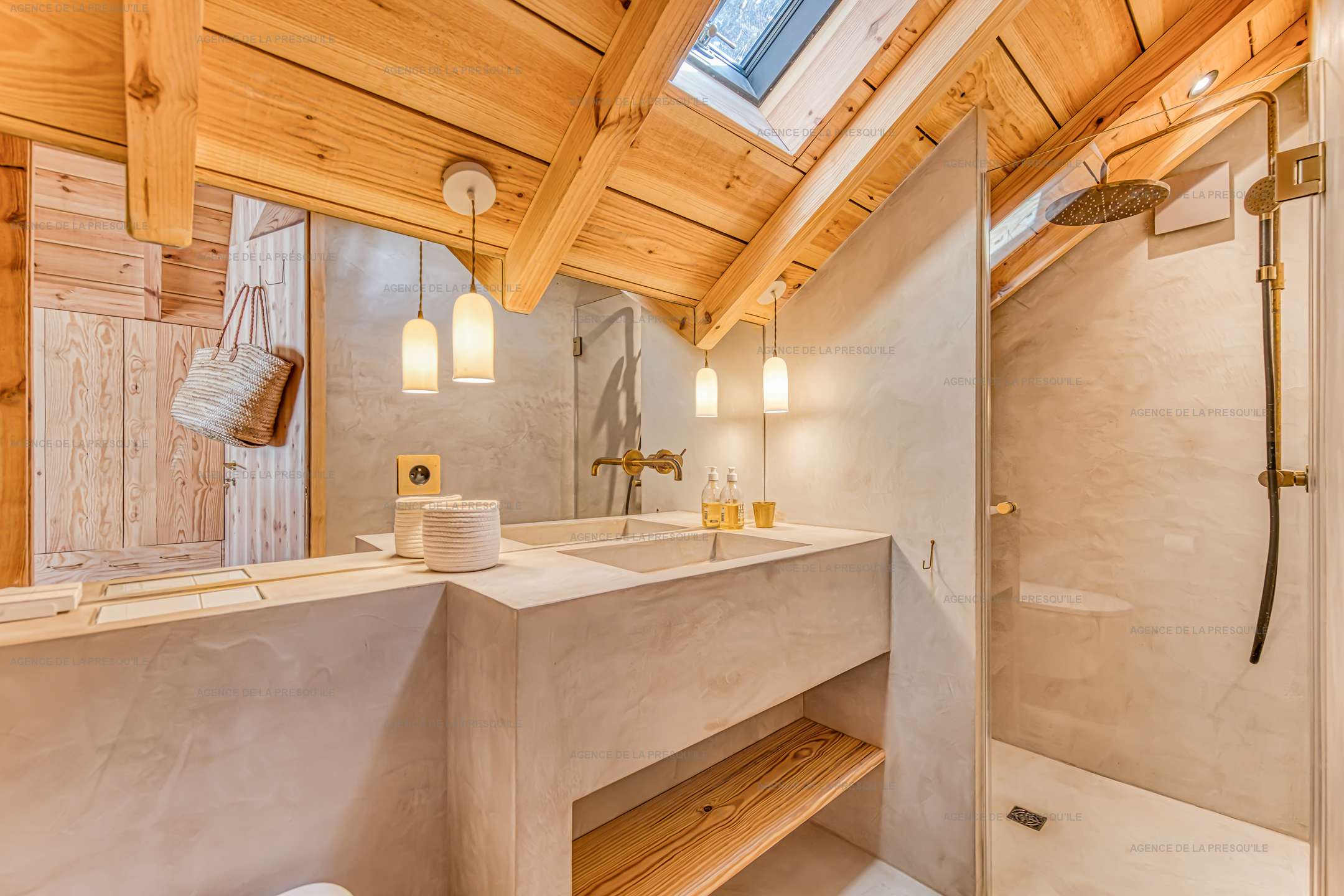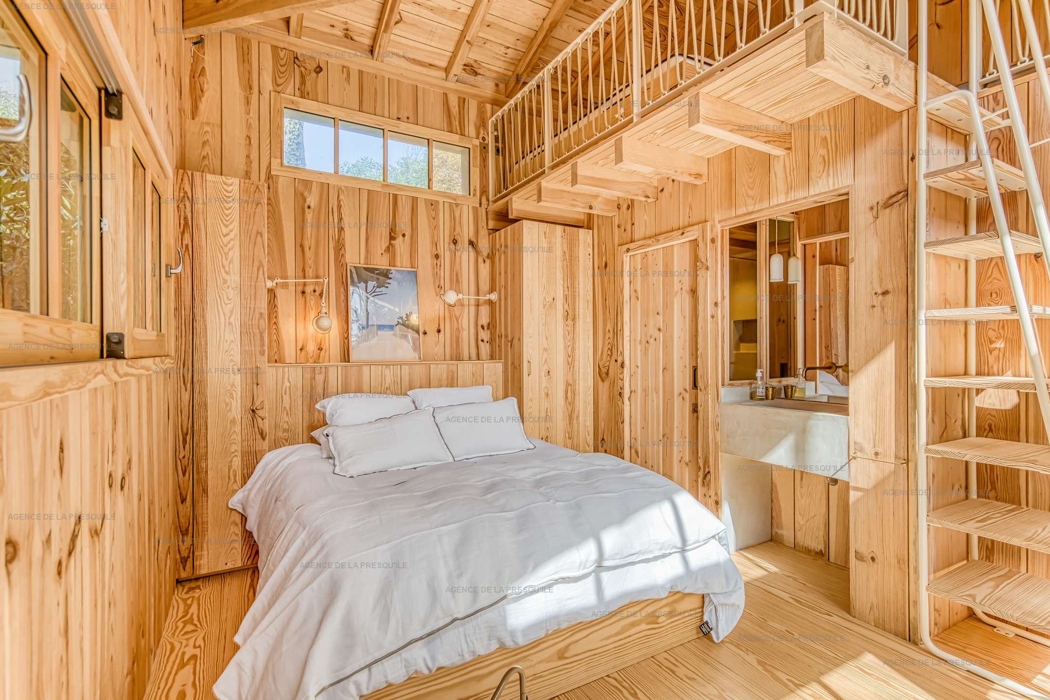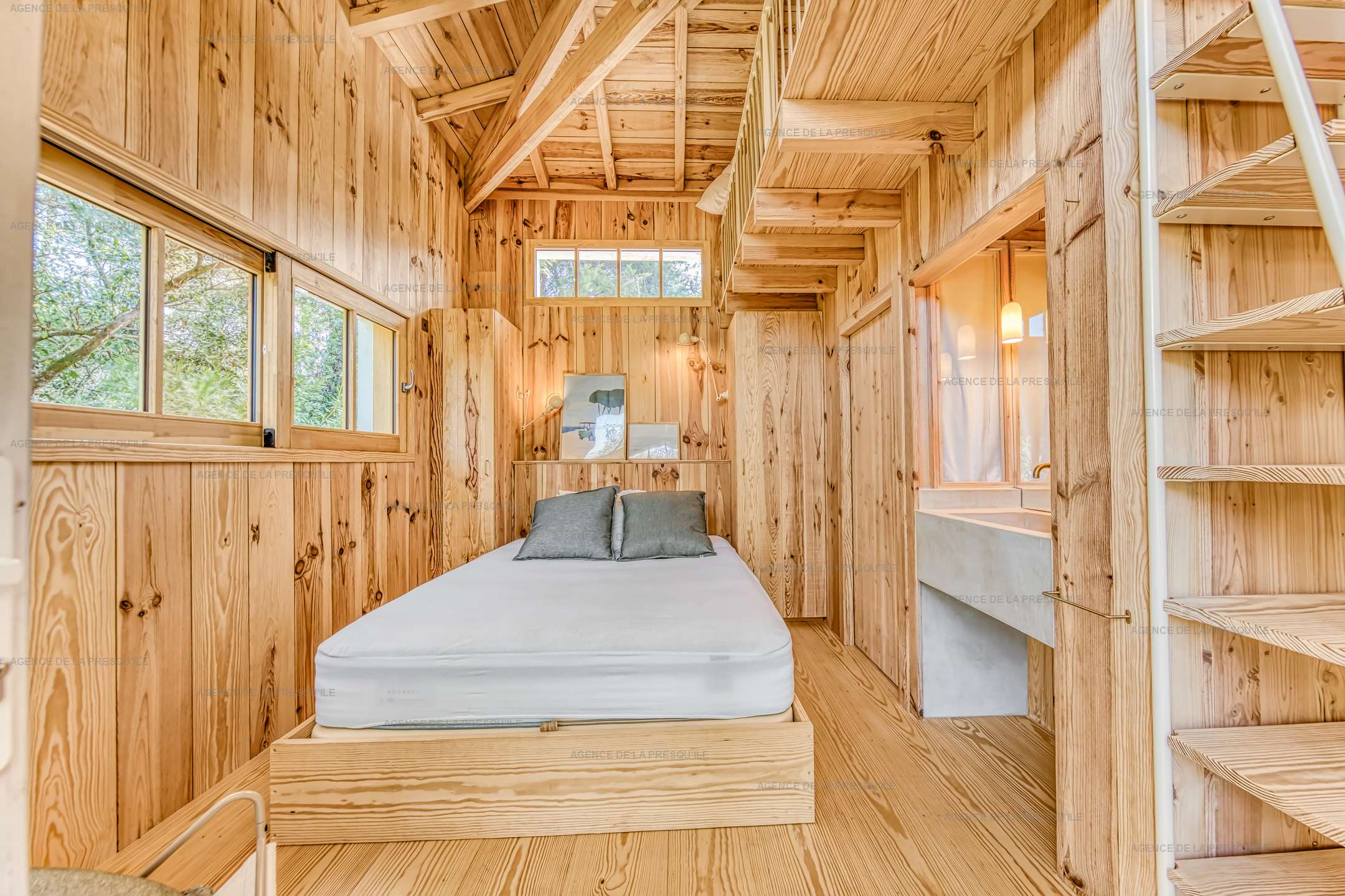 La maison principale offre au rez de chaussée un espace de vie salon, salle à manger et cuisine ouverte, une buanderie, des WC indépendants et une première chambre double (lit 180cm). À l’étage, vous trouverez une seconde chambre double (lit 160cm), une chambre dortoir (lits 4x90cm) et un bureau. Deux dépendances avec une chambre double chacune (lit 160cm) complètent l’ensemble. Toutes les chambres sont conçues comme de véritables suites, disposant chacune de leur salle de douche, WC japonais et dressing.