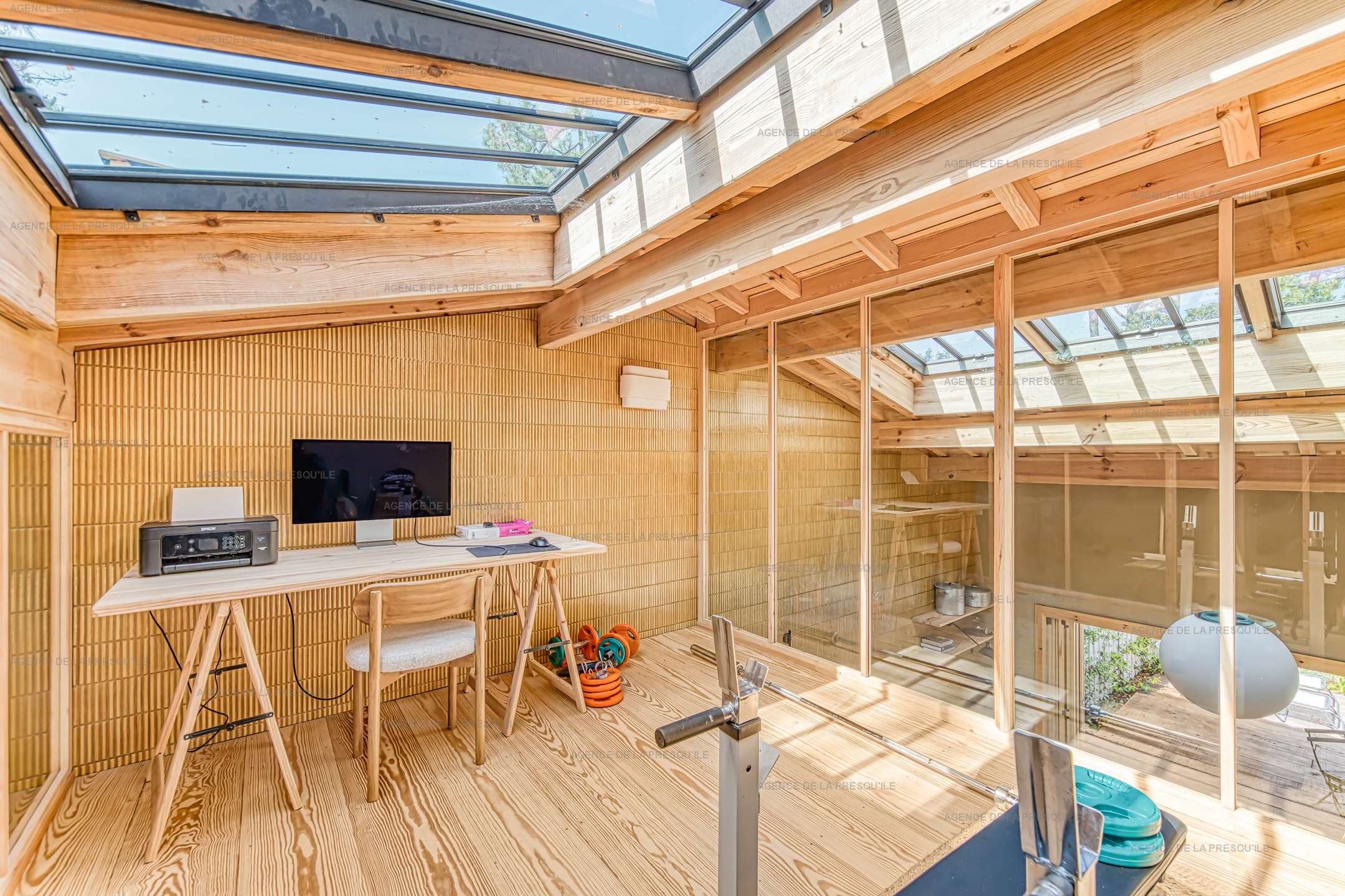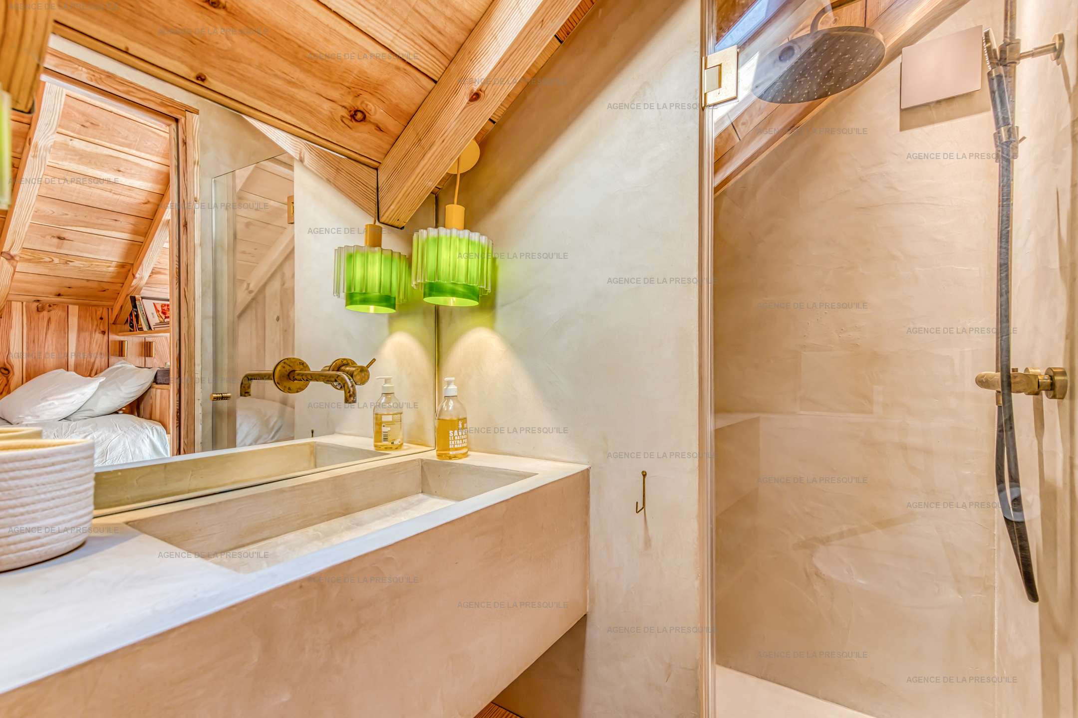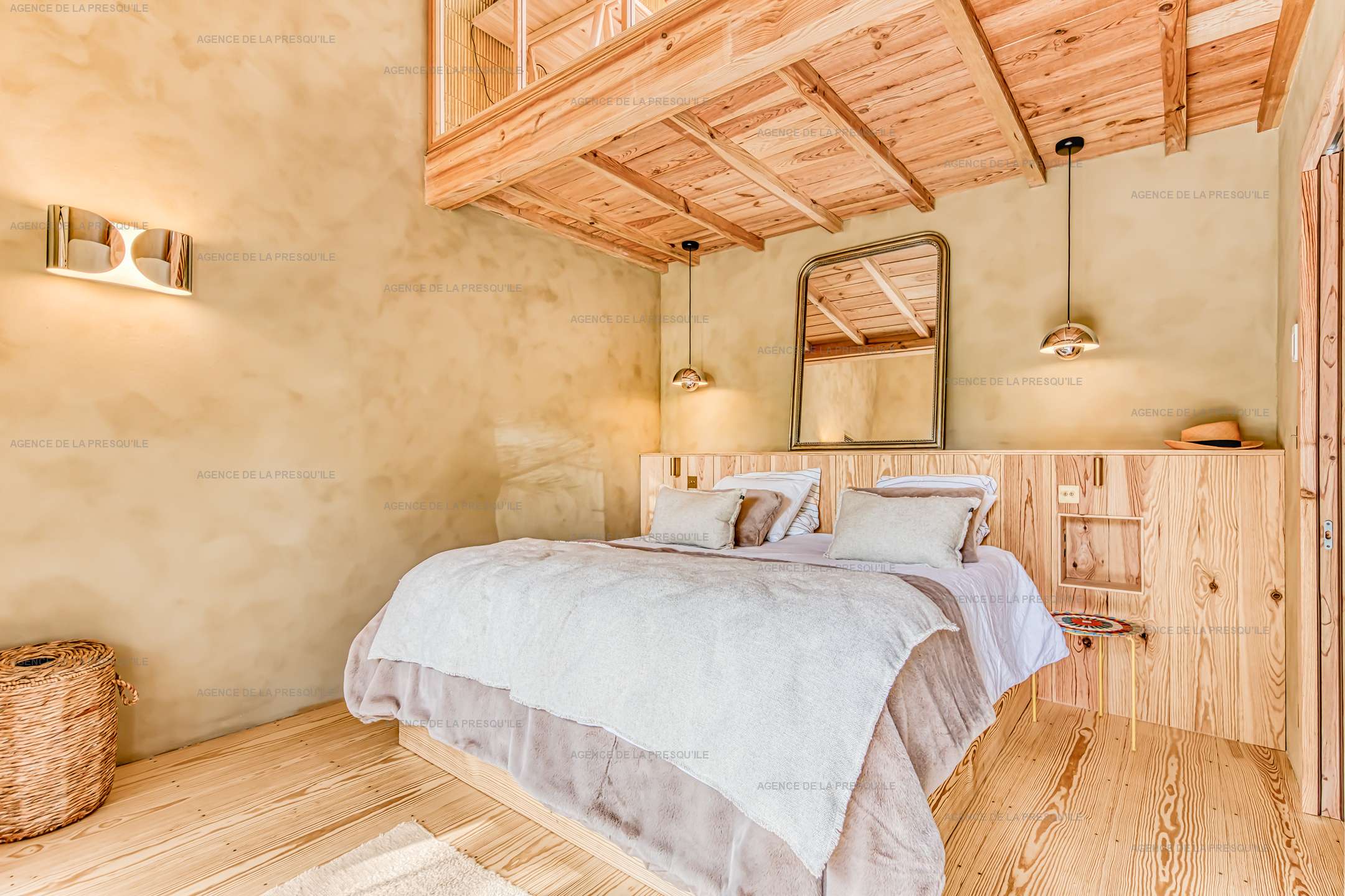 La maison principale offre au rez de chaussée un espace de vie salon, salle à manger et cuisine ouverte, une buanderie, des WC indépendants et une première chambre double (lit 180cm). À l’étage, vous trouverez une seconde chambre double (lit 160cm), une chambre dortoir (lits 4x90cm) et un bureau. Deux dépendances avec une chambre double chacune (lit 160cm) complètent l’ensemble. Toutes les chambres sont conçues comme de véritables suites, disposant chacune de leur salle de douche, WC japonais et dressing.