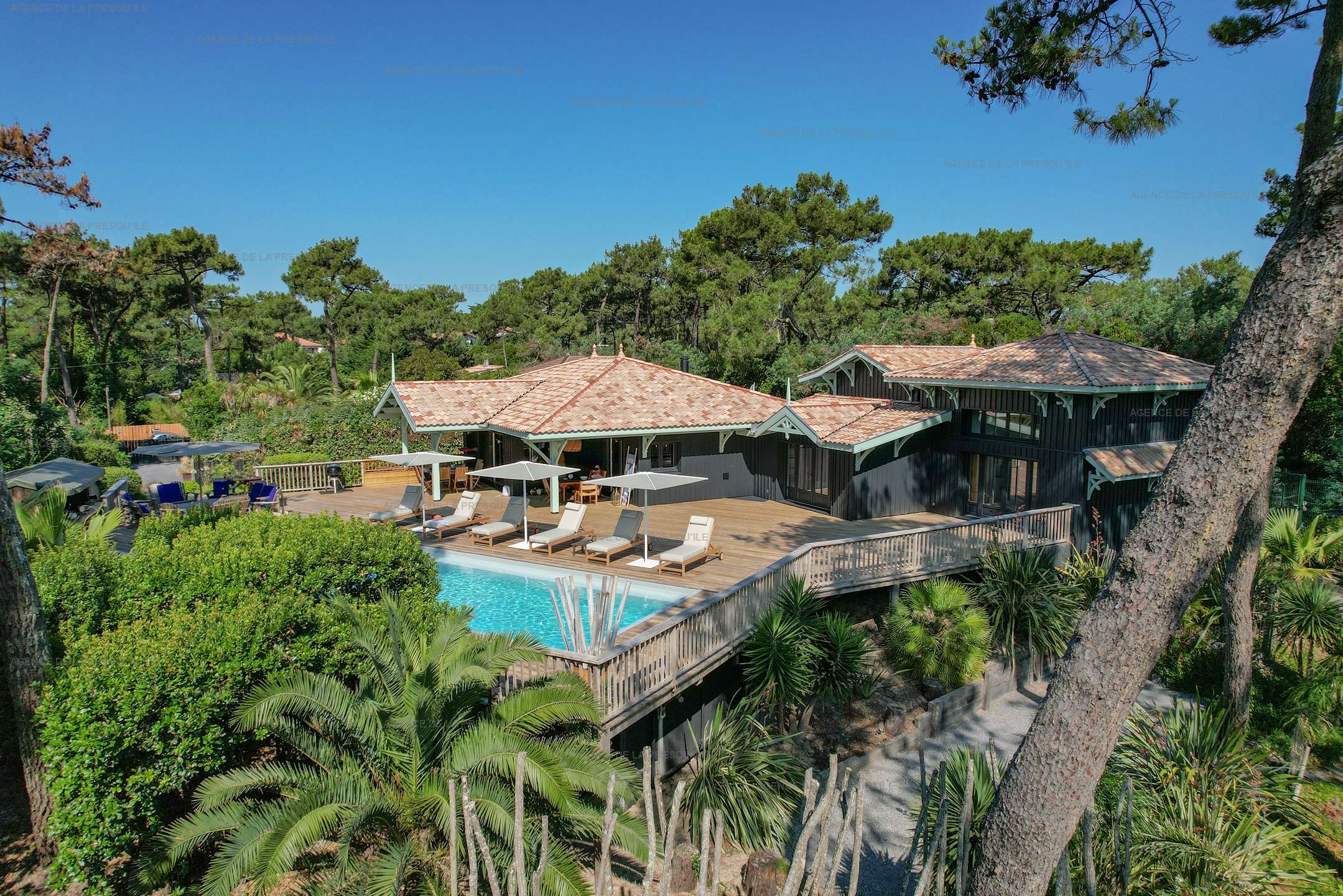 Les extérieurs arborés et clos vous permettent de profiter de grandes terrasses en bois, espace détente avec mobilier de jardin, piscine chauffée et espace repas / apéritif avec bar équipé.