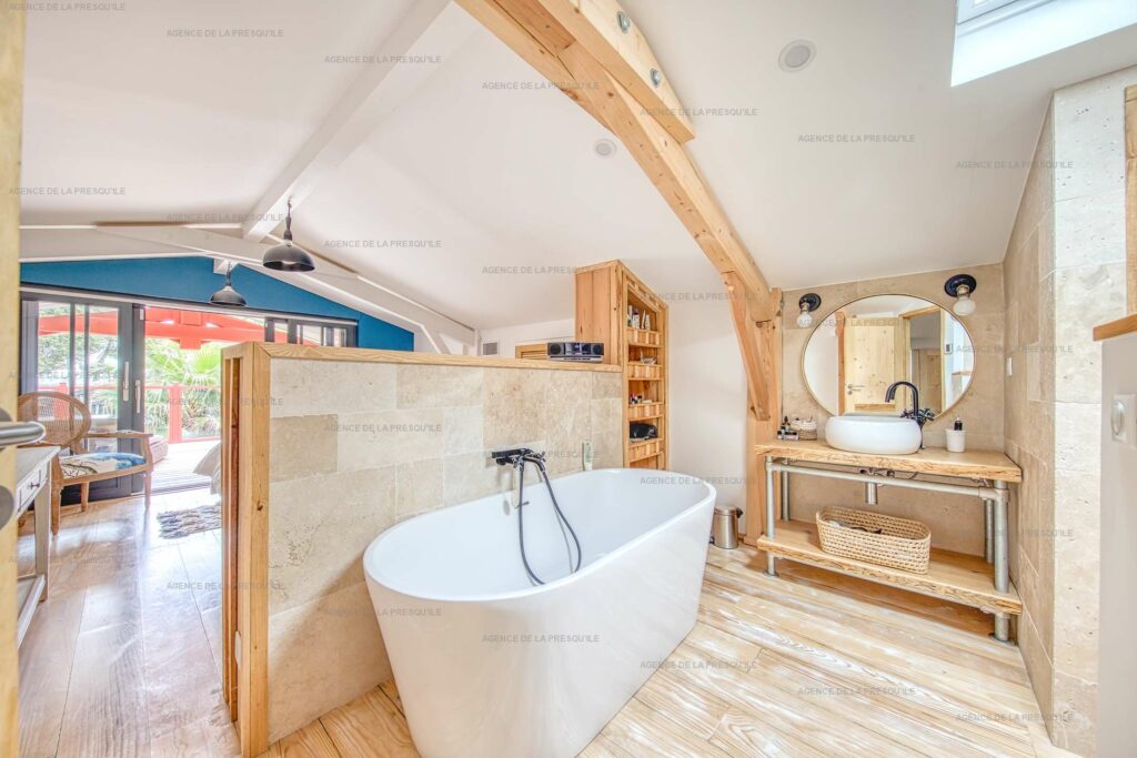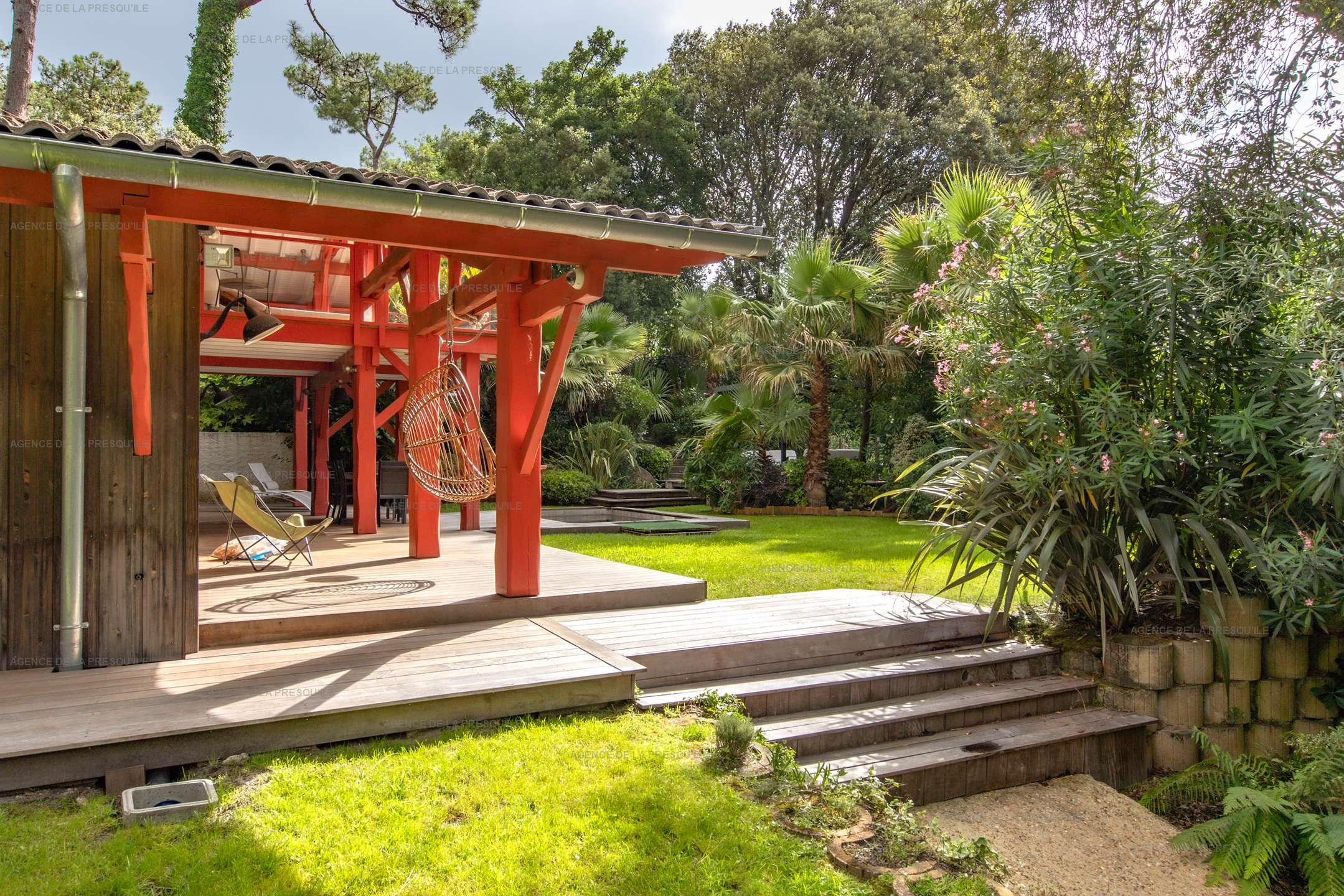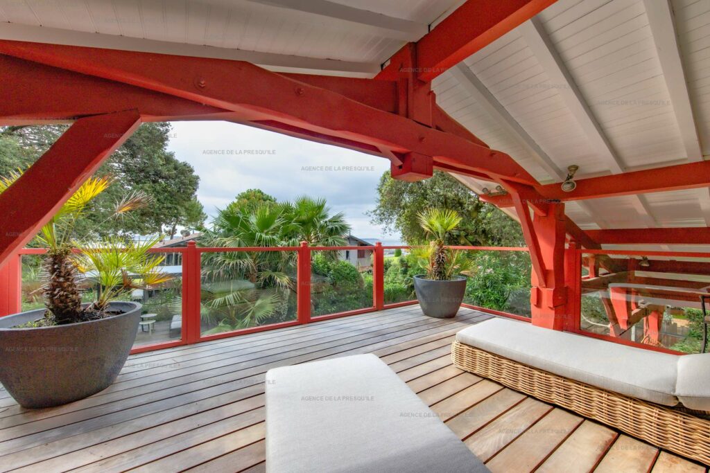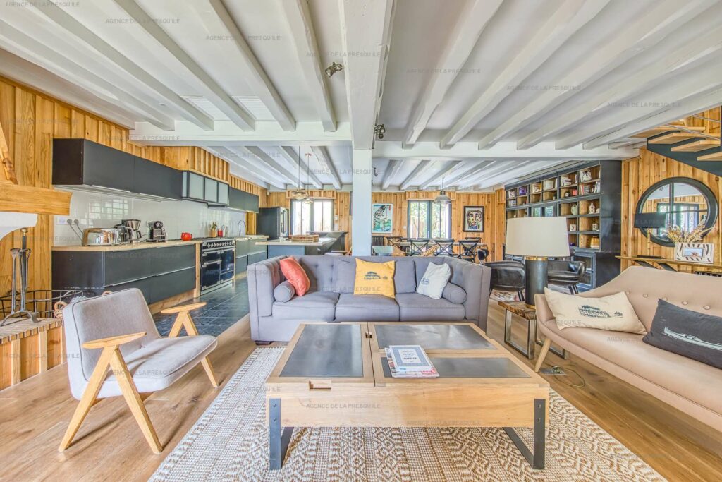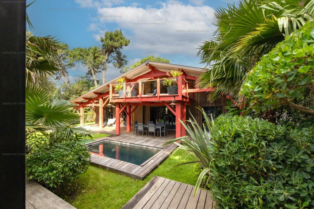 Ses extérieurs joliment paysagés vous proposent plusieurs espaces terrasses, un bassin avec fond mobile, un portillon vous donnant accès à la Plage de l’Herbe et parking.
