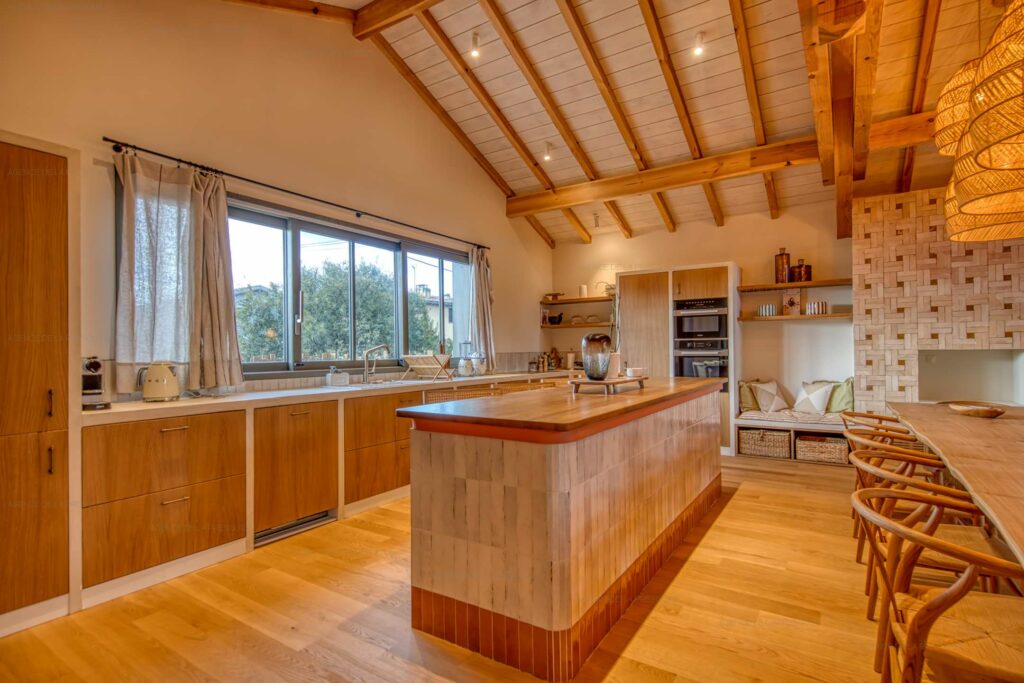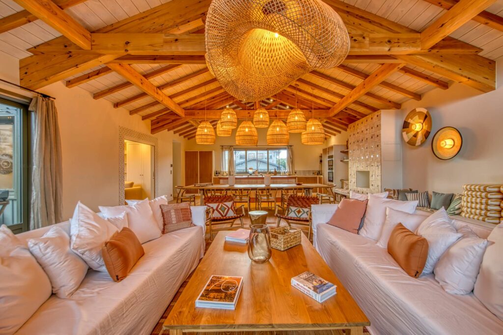 La villa principale offre un grand espace de vie avec cuisine toute équipée, salon/salle à manger, un second salon tv, des wc séparés, un espace buanderie et une première chambre double avec salle d’eau et wc attenants. La partie nuit continue à l’étage avec la suite parentale donnant sur la piscine, salle de bains complète et wc attenants, deux autres chambres chacune avec salle d’eau et wc.