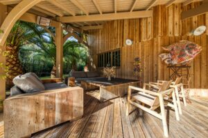 La villa comprend un spacieux salon salle à manger avec cuisine ouverte, deux chambres avec salles d’eau et WC.Vous disposez en extérieur de grandes terrasses bois sur un beau jardin arboré donnant accès à trois cabanons indépendants : l’un offre une magnifique suite parentale avec salle de bains et wc, le second propose deux chambres séparées par une salle d’eau et un wc, le troisième dispose d’un grand lit avec salle d’eau et WC.
