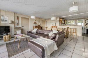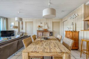 Vous disposez d’un salon/salle-à-manger ouvert sur une cuisine équipée, une première chambre avec salle d’eau et WC attenants, trois autres chambres doubles, une salle d’eau, des WC séparés et une buanderie.