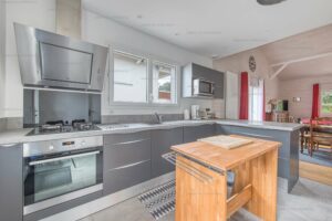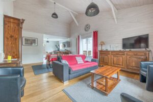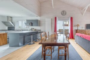 Elle est composée d’un salon, une cuisine américaine avec cellier attenant, trois chambres dont une avec salle d’eau, une salle d’eau avec wc, et un wc indépendant.