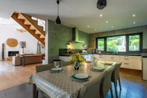 A l’extérieur, sur un beau terrain clos et paysagé, vous profiterez de belles terrasses avec coin repas et salon de jardin, d’une douche extérieure et d’une place de parking avec borne de recharge pour véhicules électriques.