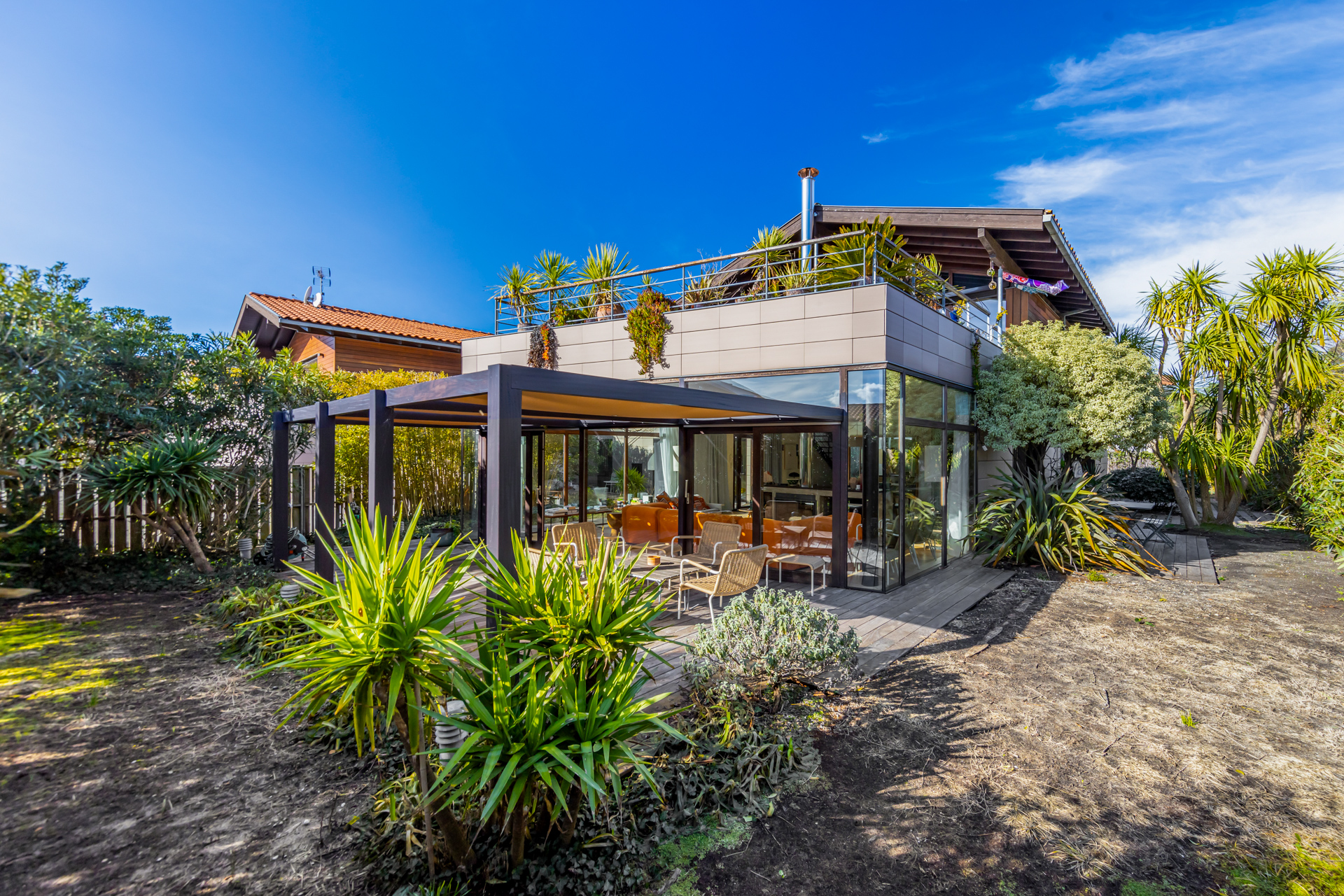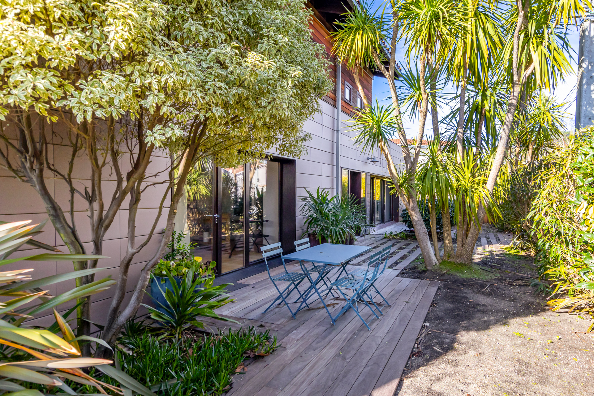 Les extérieurs alternant jardin et terrasses bois permettent de suivre le soleil tout au long de la journée.