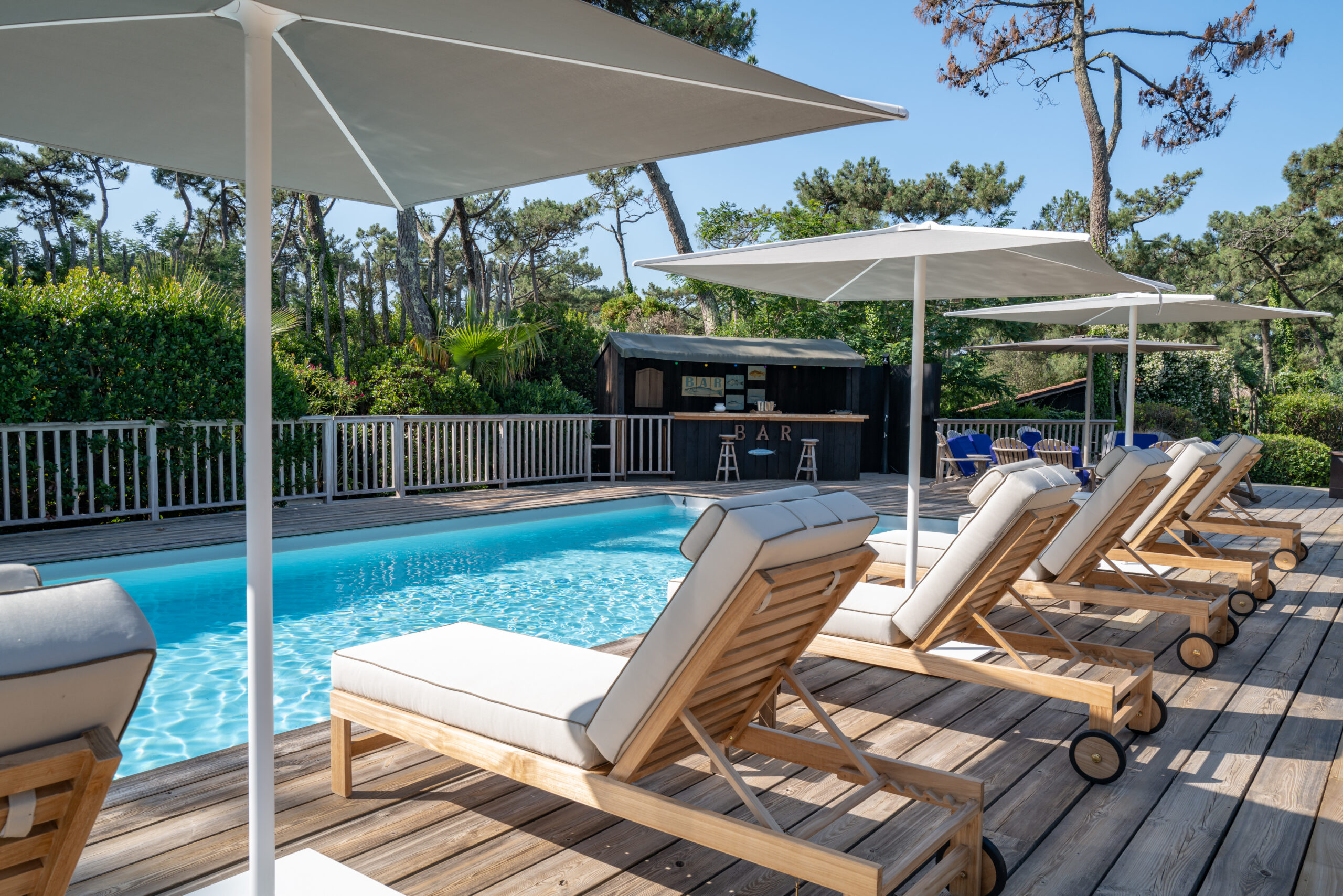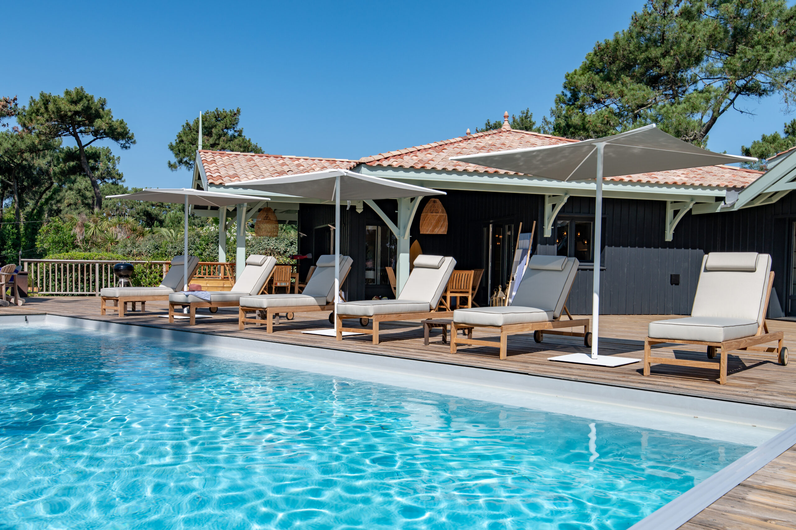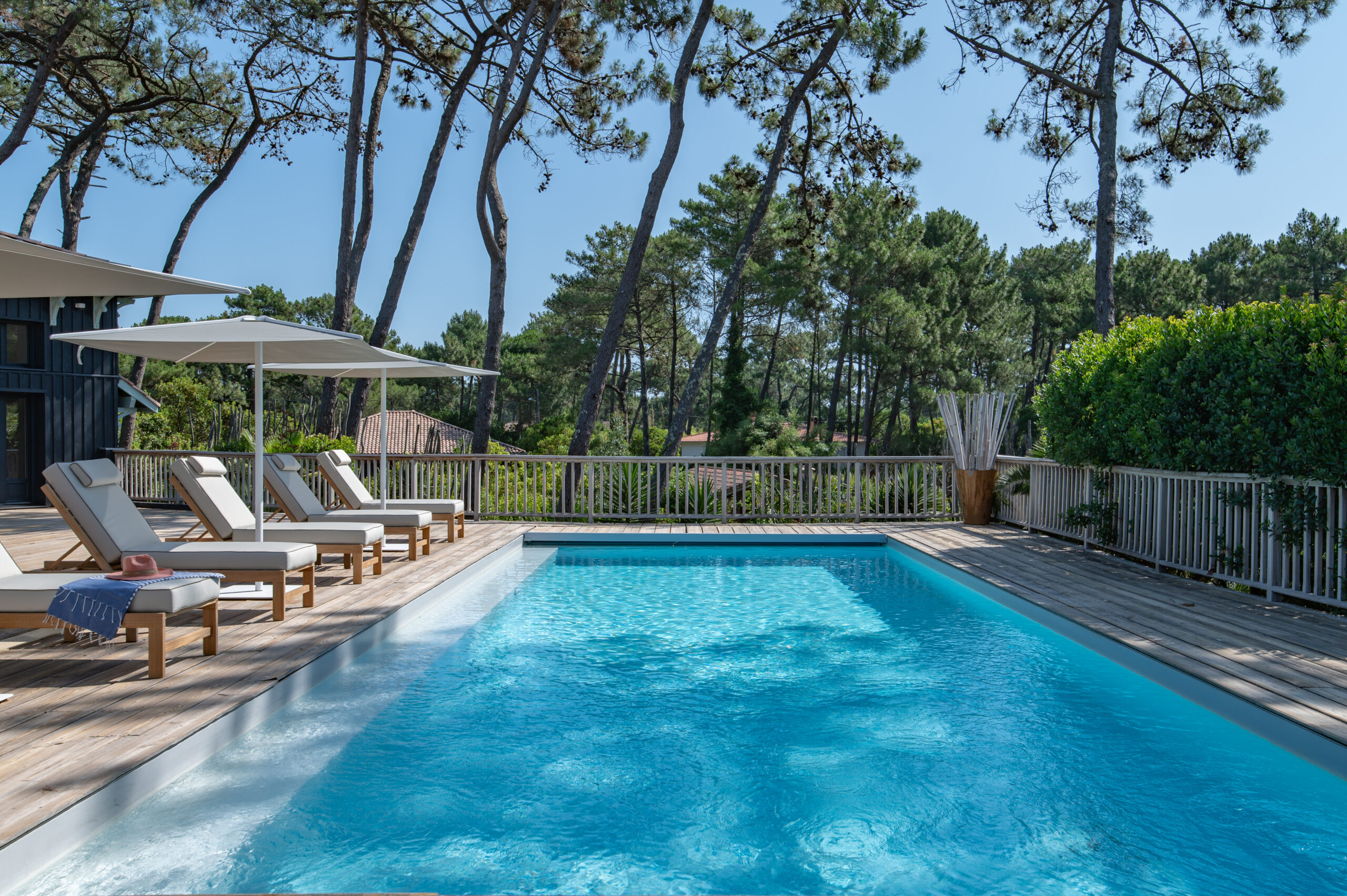 Les extérieurs arborés et clos vous permettent de profiter de grandes terrasses en bois, espace détente avec mobilier de jardin, piscine chauffée 13×5 au sel et espace repas / apéritif avec bar équipé, boulodromme.