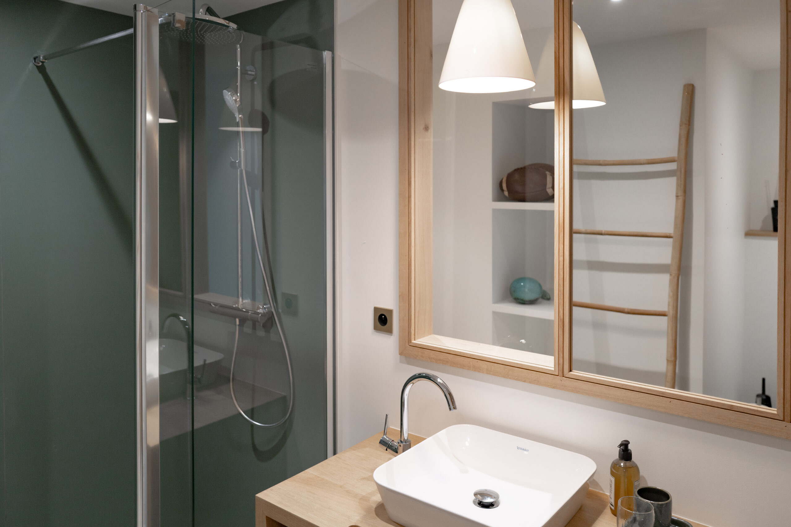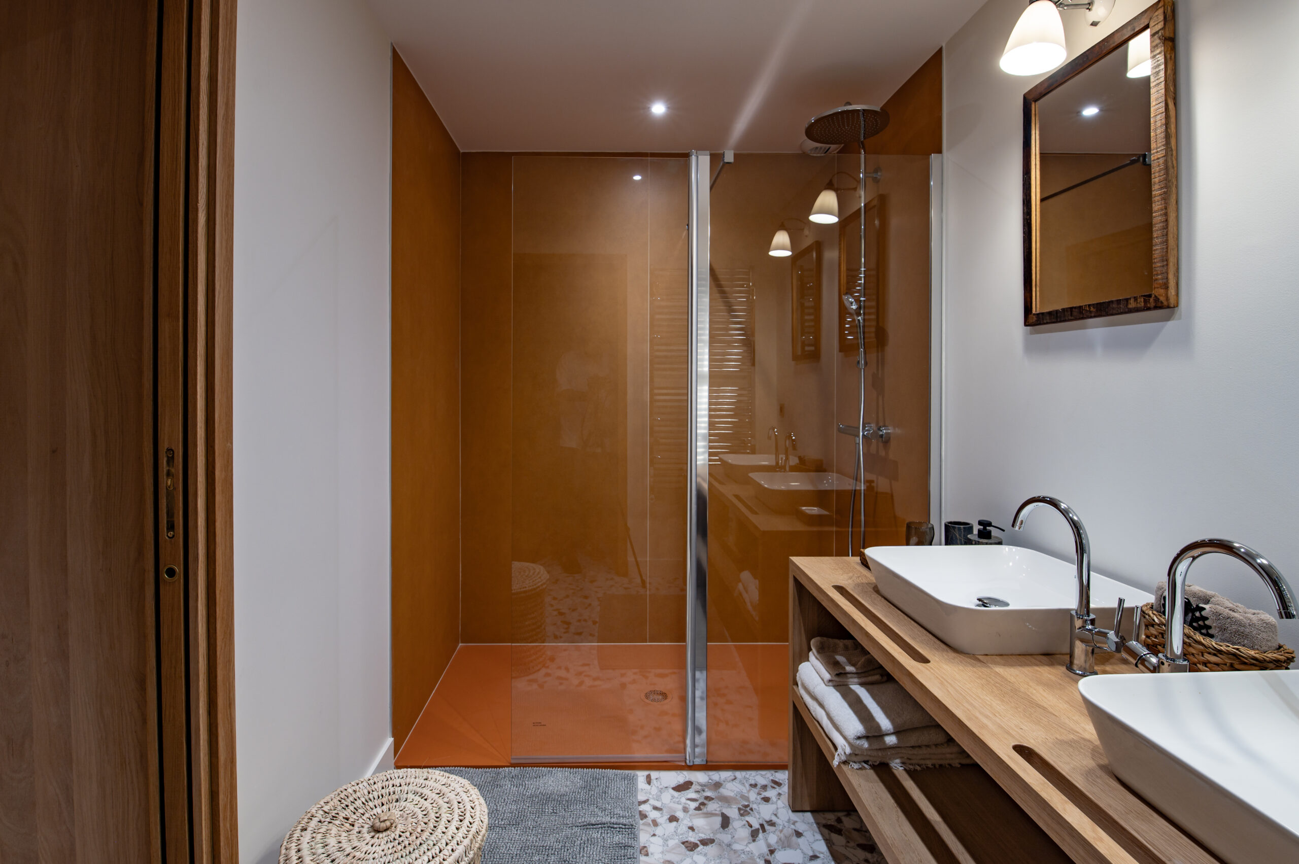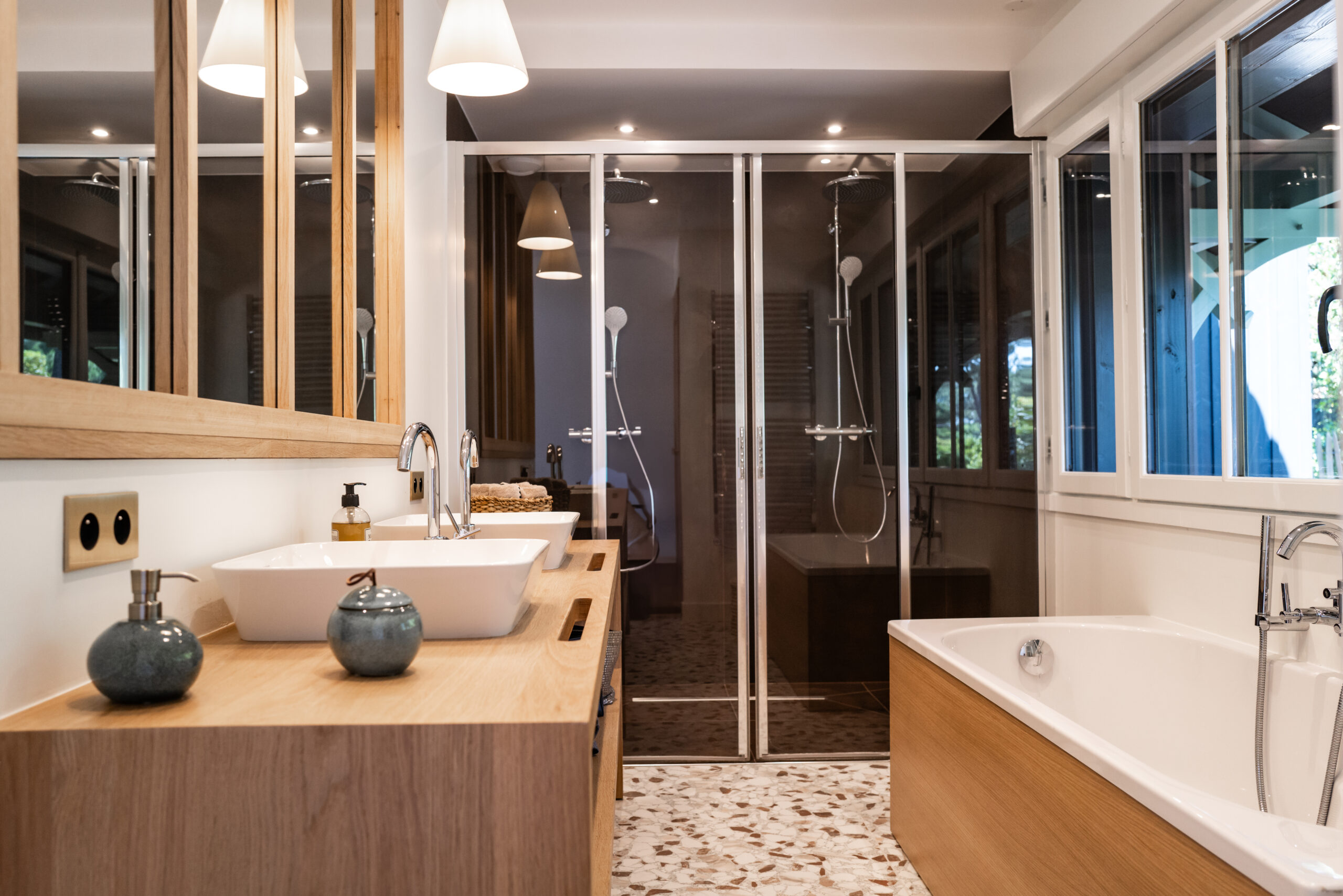 Les extérieurs arborés et clos vous permettent de profiter de grandes terrasses en bois, espace détente avec mobilier de jardin, piscine chauffée 13×5 au sel et espace repas / apéritif avec bar équipé, boulodromme.