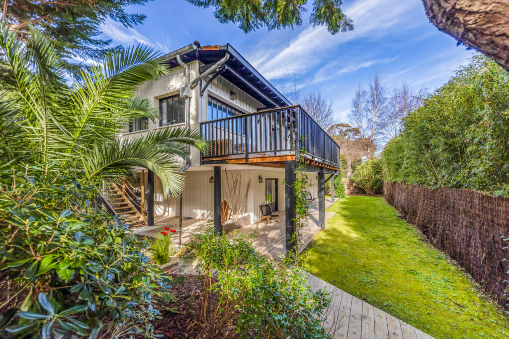 Extérieur paysagé, belle exposition et environnement paisible. Accès bassin à pieds. Parking privé. Une maison idéale pour profiter pleinement de la vie au Ferret, entre plages du Bassin et vagues de l’Océan.