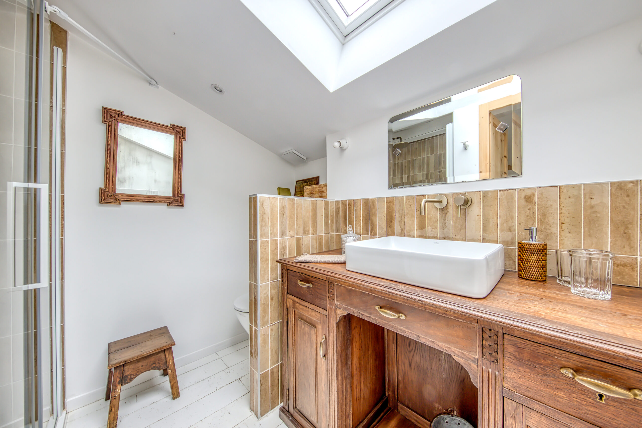 Côté nuit, vous trouverez une suite parentale avec salle d’eau et WC, ainsi qu’une seconde chambre avec sa propre salle d’eau et WC.