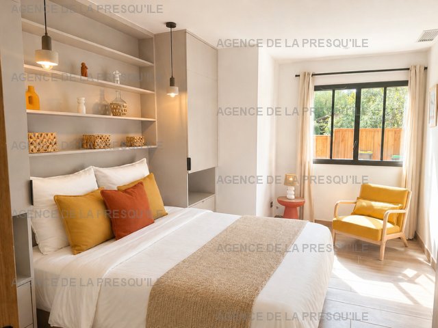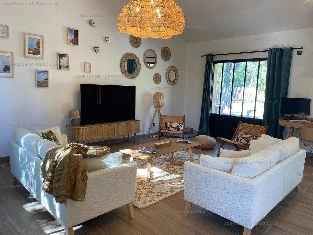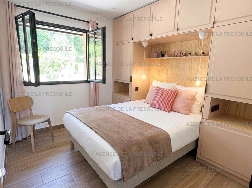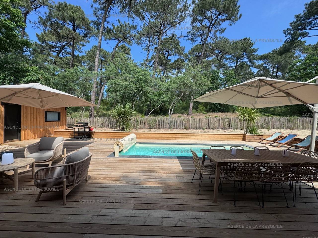 A l’extérieur, une agréable terrasse aménagée avec coin repas et salon de jardin, piscine chauffée et sécurisée.Deux places de stationnement sont à votre disposition; terrain clos offrant une vue dégagée sur la pinède.