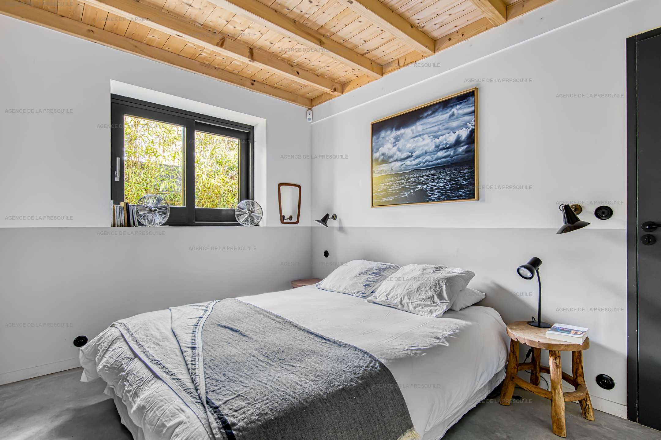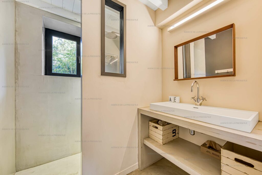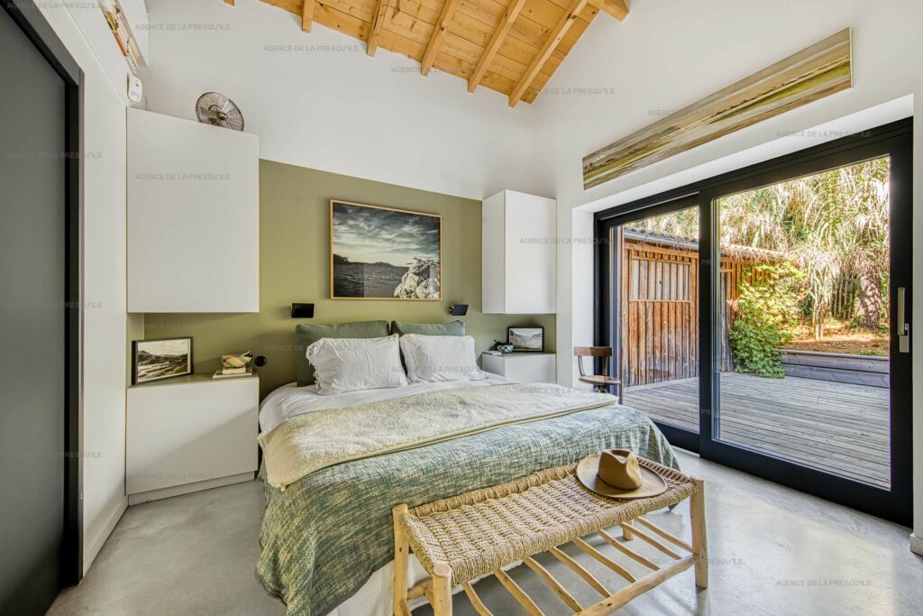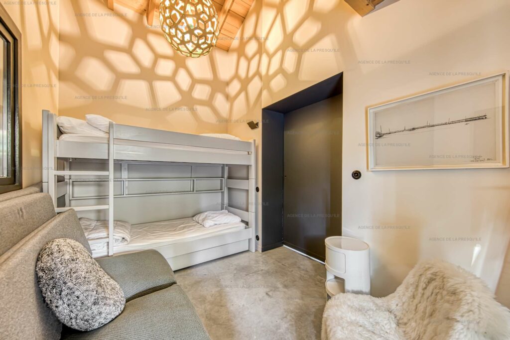 Côté nuit, la villa propose une suite parentale avec un lit en 180 cm, une salle d’eau et des WC privatifs. Une deuxième chambre double communique avec une troisième chambre équipée de lits superposés. Cette dernière peut s’ouvrir soit sur l’extérieur, soit sur la chambre attenante, ce qui la rend à la fois pratique et modulable selon les besoins.